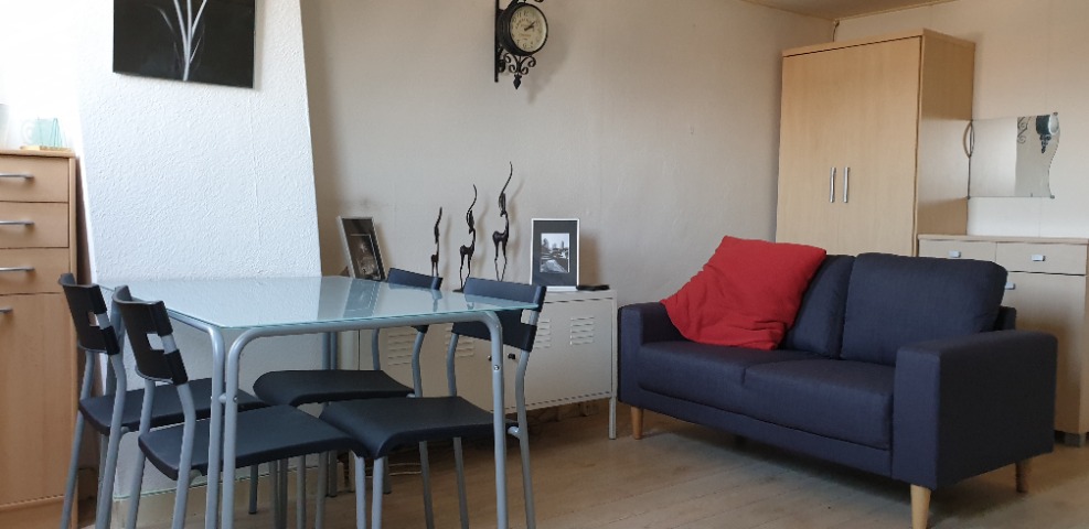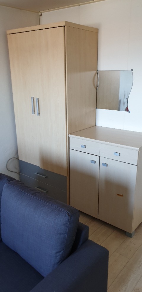 Gemeubileerd met een nieuw bankje, tafeltje, bed met matras en beddengoed, ladekast, opbergkasten, tafel met 4 stoelen, garderobekast.